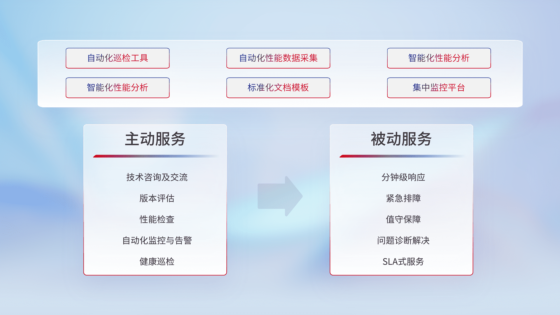 智能化工具和标准化文档,,,,保障服务质量,,提供主动服务(包含技术咨询、、版本评估、、、性能检查、、自动化监控与告警、、、健康巡检)和被动服务包含(分钟级响应、、紧急排障、、、、值守保障、、问题诊断解决、、SLA服务)。。
